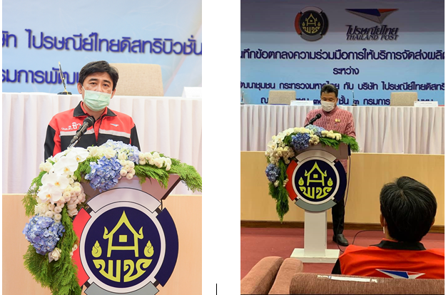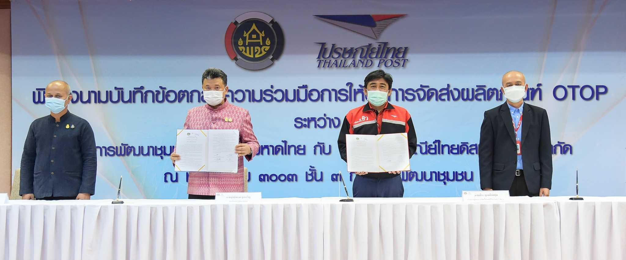 ที่กรมการพัฒนาชุมชน กระทรวงมหาดไทย ได้มีพิธีลงนามบันทึกข้อตกลงความร่วมมือ (MOU) ระหว่าง บริษัท ไปรษณีย์ไทยดิสทริบิวชั่น จำกัด ( ปณด ) ซึ่งเป็นบริษัทในเครือของบริษัท ไปรษณีย์ไทย จำกัดกับ กรมการพัฒนาชุมชน (พช.)กระทรวงมหาดไทย ในการให้บริการจัดส่งผลิตภัณฑ์ OTOP ของผู้ผลิต ผู้ประกอบการไปยังลูกค้าที่สั่งซื้อผลิตภัณฑ์ทั่วประเทศ ด้วยบริการที่ครบวงจร ช่วยลดต้นทุน และลดภาระการขนส่ง โดยมีนายพีระ อุดมกิจสกุล กรรมการผู้จัดการบริษัท ไปรษณีย์ไทยดิสทริบิวชั่น จำกัด ร่วมลงนามบันทึกข้อตกลงความร่วมมือ (MOU) กับนาย สุทธิพงษ์ จุลเจริญ อธิบดีกรมการพัฒนาชุมชน ซึ่งได้รับเกียรติจาก คุณพงษ์ทร วิเศษสุวรรณ รองกรรมการผู้จัดการใหญ่ ด้านธุรกิจขนส่งและโลจิสติกส์ สายงานธุรกิจองค์กร บริษัทไปรษณีย์ไทย จำกัดร่วมเป็นสักขีพยาน